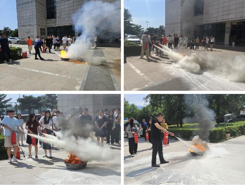 随后,消防科老师在学院楼前空旷处对灭火器的种类和操作方法进行了演示,并模拟火灾现场对师生们进行了灭火器实操训练。
