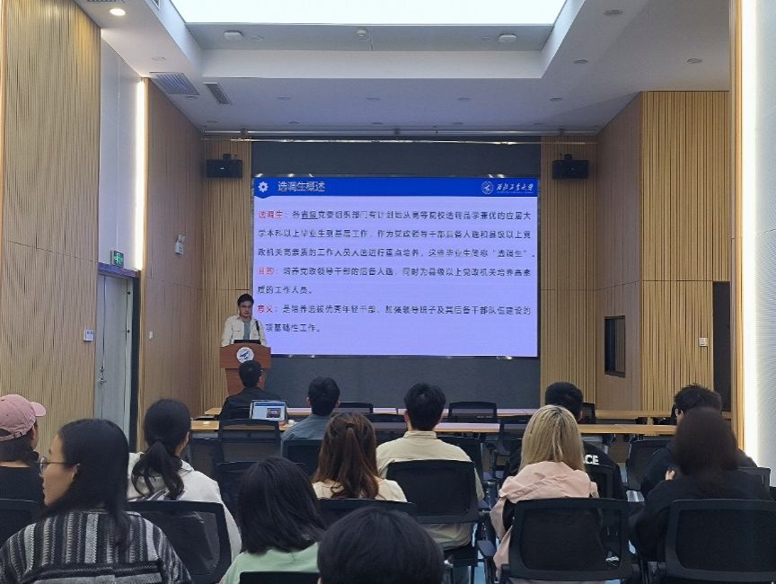 会上,2024届硕士毕业生曾庆同学,以广西选调生的新身份,率先登台。他深入浅出地阐述了选调生与普通公务员之间的显著差异,帮助同学们厘清了两者之间的界限。随后,曾庆同学围绕选调生的报名条件、备考过程以及学校选调生的开展情况等多个环节,进行了详尽而细致的解读。他结合自身的报考经历,给出了许多宝贵的建议,使同学们对选调生考试有了更为深刻和清晰的认识。